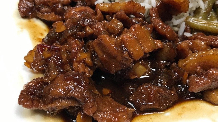 Langzaam gegaard varkensvlees in een zoete ketjapsaus met ui en Indonesische kruiden.